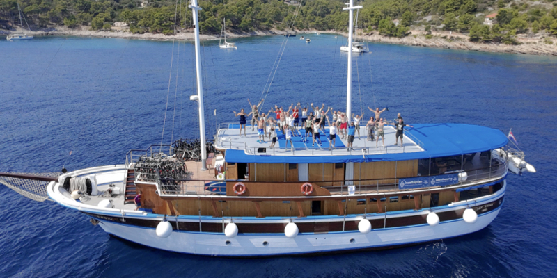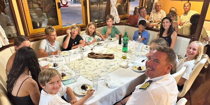 Was diese Reise wirklich besonders machte, war das Gefühl an Bord. Es gab keine festen Sitzordnungen. Jeder setzte sich einfach dazu, wo gerade Platz war. Gespräche entstanden von selbst. Besonders die Kinder auf unserer Tour, alle im Alter zwischen zehn und 19 Jahren, schlossen schnell Freundschaften – trotz unterschiedlicher Nationalitäten und Sprachen. Sie erkundeten gemeinsam die lokalen Märkte, gingen in ein Freiluftkino, sprangen vom oberen Schiffsdeck ins Meer und verbrachten Stunden auf SUPs oder Schwimmkissen. Die Erwachsenen fanden genauso leicht zueinander: Sie genossen einen Drink in einem der Hafencafés, spielten Brettspiele an Deck oder unterhielten sich einfach, während die Küste an ihnen vorbeizog. Die internationale Mischung aus Gästen aus Italien, Spanien, der Schweiz, Österreich, Deutschland und den Niederlanden, trug besonders zur Atmosphäre bei und Englisch wurde schnell zur gemeinsamen Sprache.