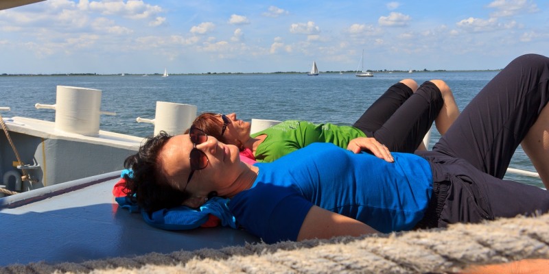 Wenn schließlich der Motor verstummt und das Schiff nur noch vom Wind getragen wird, entsteht eine besondere Ruhe auf dem Wasser. Man hört das Rascheln der Segel und das leise Gleiten des Schiffes über das IJsselmeer.