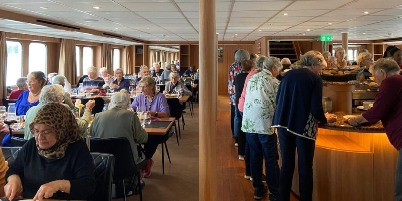 Viele dieser Seniorinnen und Senioren leben allein oder haben nur wenig soziale Kontakte. In Zusammenarbeit mit dem Musikprogramm Tour de Chant und der Amsterdamer Stadtbibliothek (OBA) konnten wir Menschen aus Stadtteilen wie Molenwijk, Reigersbos und Mercatorplein erreichen. Taxis von TCA brachten sie sicher zum Hafen, wo unsere Crew sie mit einem Lächeln und einem liebevoll vorbereiteten Buffet empfing.