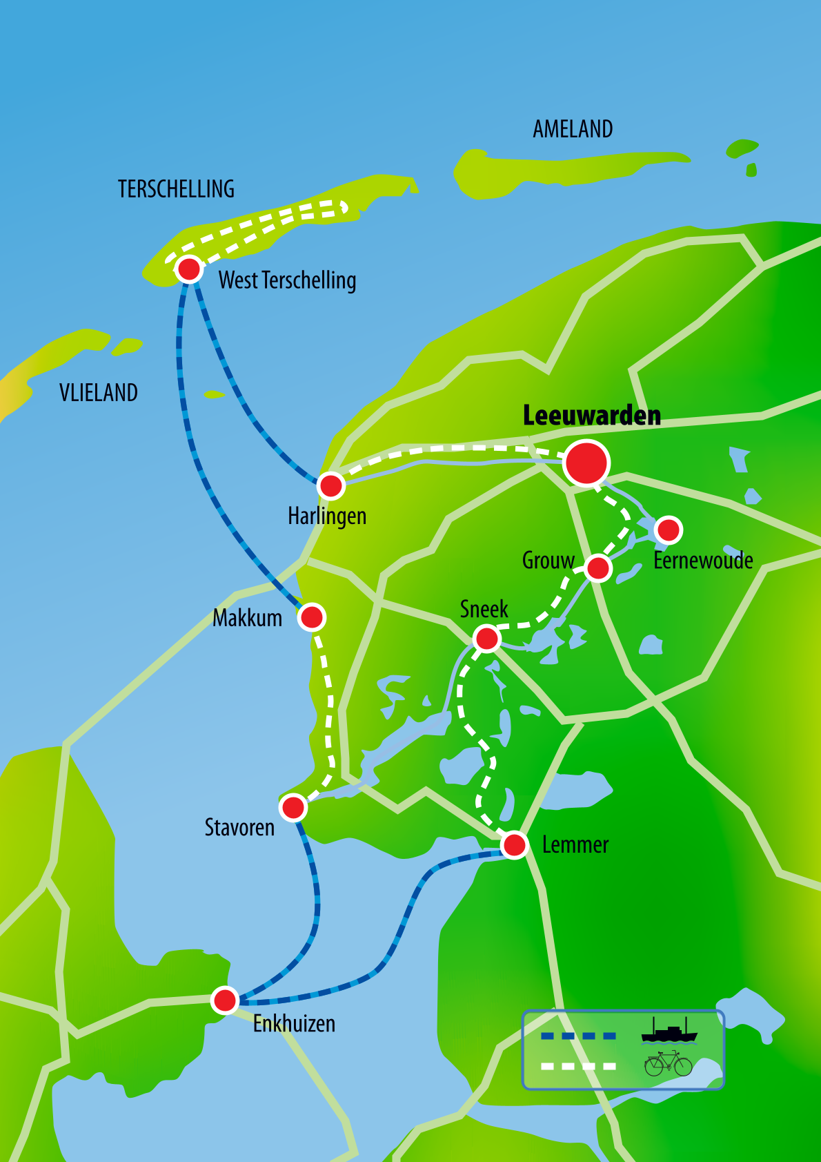 Auf dieser 8-tägigen Rundreise lernen Sie die vielen verschiedenen Facetten dieser traditionsreichen Provinz kennen. Radeln Sie durch weite Wiesenlandschaften und verwunschene Moorgebiete, über den IJsselmeerdeich, an hübschen Kanälen und ausgedehnten Seen entlang. Ihre Route führt Sie durch einige der historischen 11 Städte von Friesland, von denen eine hübscher als die andere ist. Manche davon sind so winzig, dass man sie für ein Dorf halten könnte. Aber eines haben sie alle gemeinsam: Sie sind durch Wasserläufe miteinander verbunden. Wir zeigen Ihnen nicht nur das Festland dieser vielseitigen Provinz, sondern unternehmen auch eine mehrstündige Fahrt über das zum UNESCO-Weltnaturerbe gehörende Wattenmeer. Unser Ziel: die wildromantische Insel Terschelling.