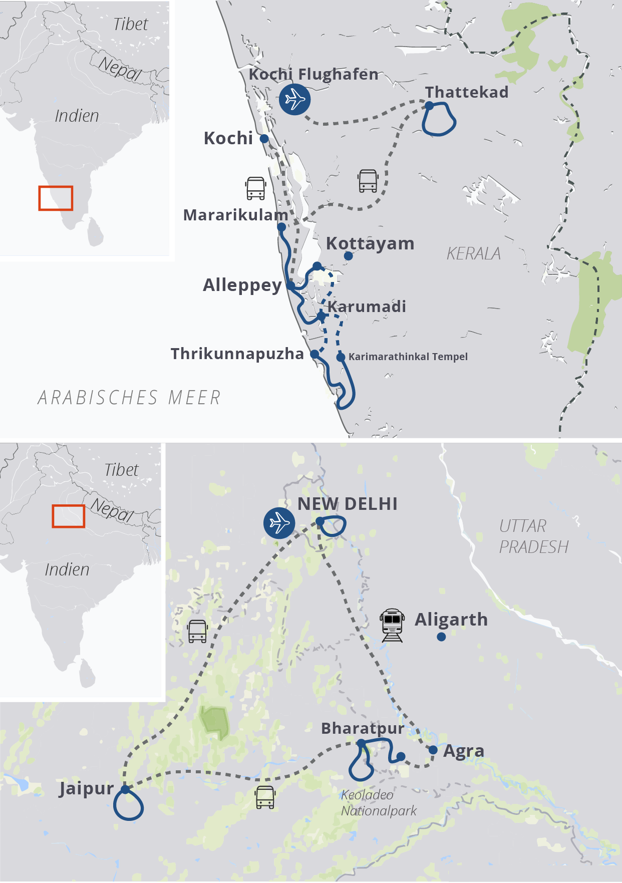 Fluganreise: Flüge nach Indien buchen Sie am besten über Ihr Reisebüro. Bitte bedenken Sie bei der Buchung Ihres Fluges, dass der Hinflug nach Kochi (Cochin International Airport / COK) gehen sollte und der Rückflug ab Delhi (Indira Gandhi International Airport / DEL) starten sollte.