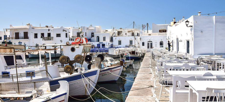 Der alte Fischerhafen ist das Herzstück von Naoussa – umgeben von kleinen Booten und farbenfrohen Fischer-Netzen und weißen, würfelförmigen Häusern, die am Abend romantisch beleuchtet werden, was eine filmreife Inselatmosphäre schafft.