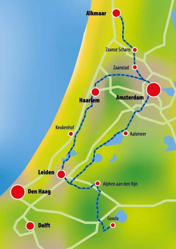 Genießen Sie Radtouren durch historische niederländische Städte wie Haarlem, Leiden, Gouda und Alkmaar. Erfahren Sie mehr über den Wasserhaushalt im Land unter dem Meeresspiegel.