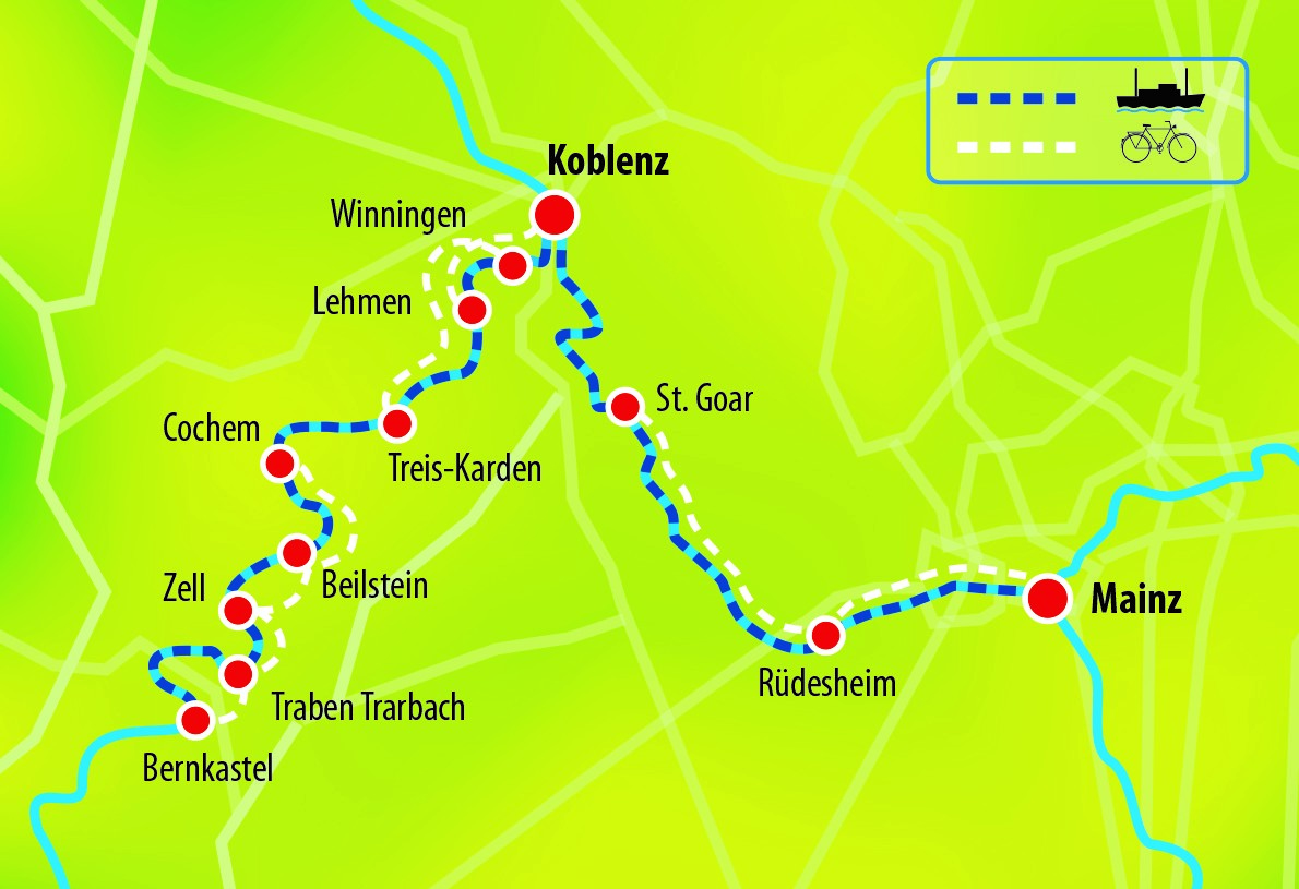 Entdecken Sie auf dieser wunderbaren Reise abwechslungsreiche Natur, tauchen Sie in die Geschichte ein und erleben Sie zwei der bekanntesten Weinanbaugebiete Deutschlands entlang der schönen Flüsse Rhein und Mosel. Wo schon die Kelten siedelten und die Römer den Weinbau einführten, verbinden Rhein und Mosel und die hervorragenden Radwege an ihren Ufern alle Sehenswürdigkeiten dieser Reise mit Fahrrad und Schiff. Start- und Endpunkt ist die Römerstadt Koblenz, wo die Mosel am Deutschen Eck in den Rhein mündet.