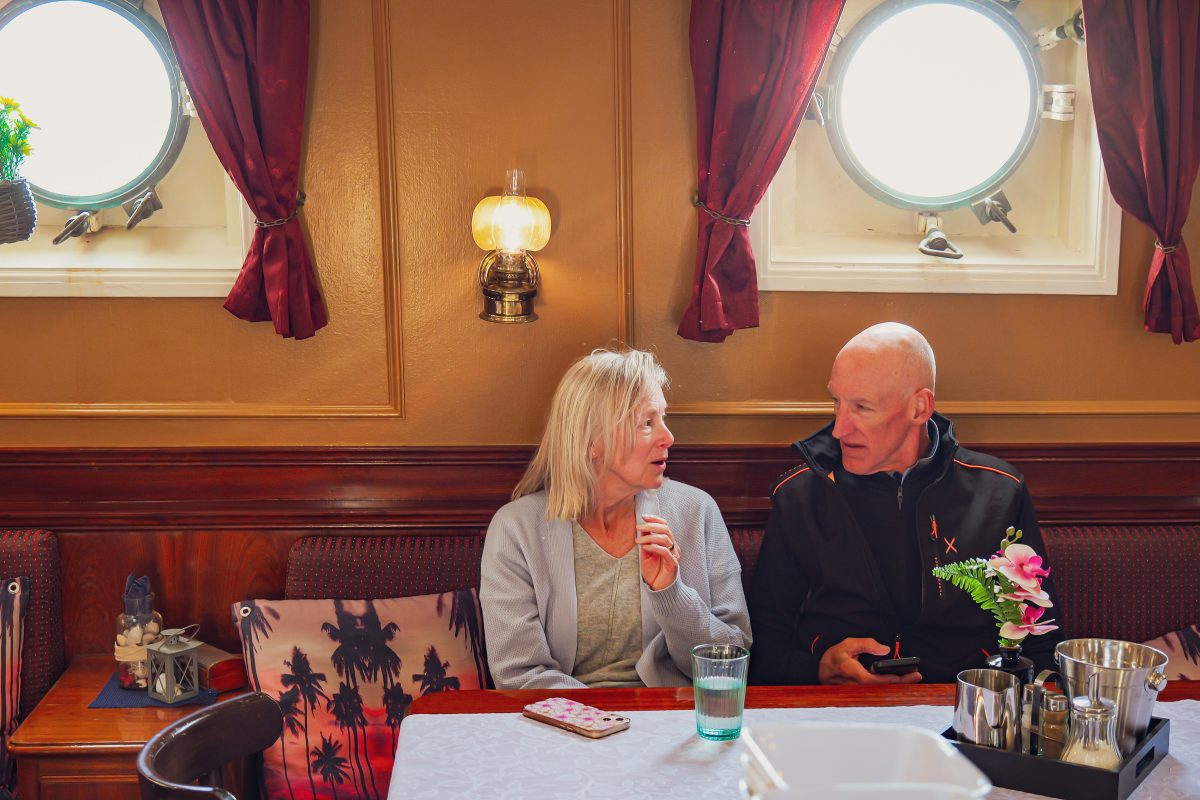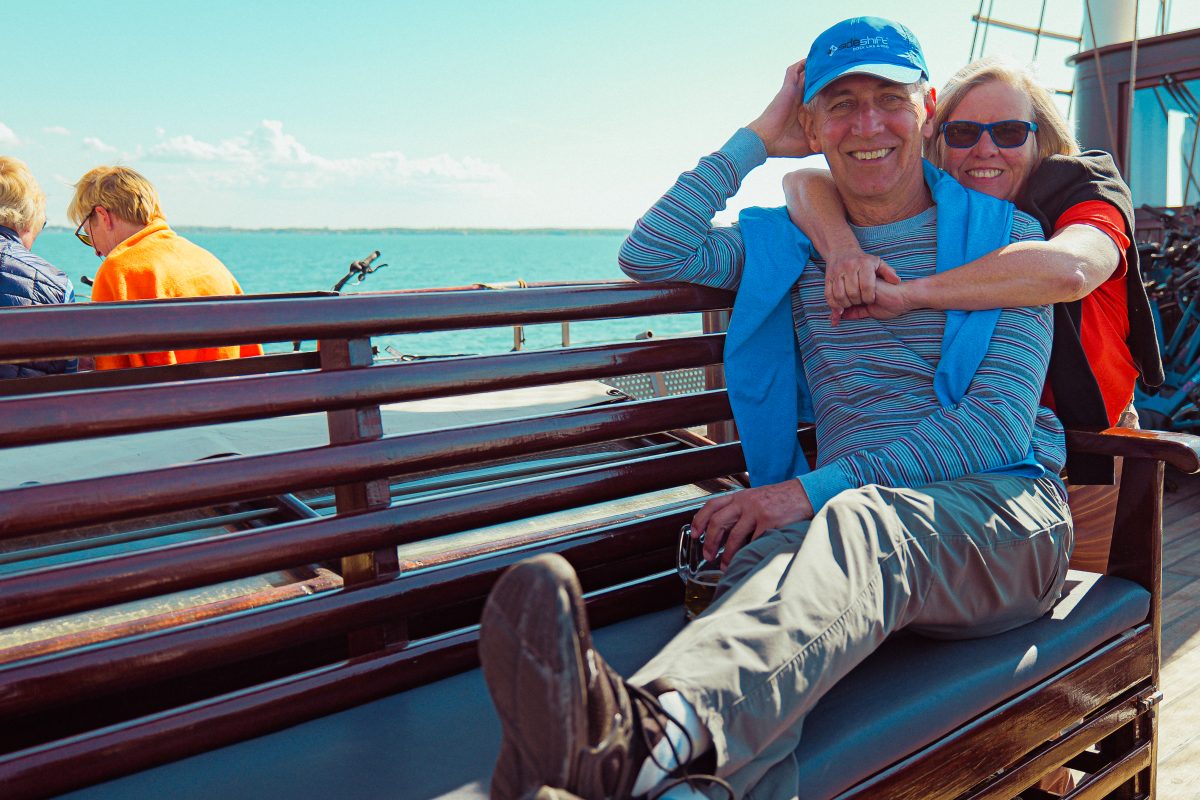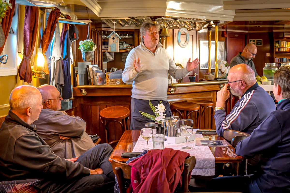 Der Salon der Atlantis ist ausgesprochen großzügig. Hier finden die Mahlzeiten statt, wenn das Wetter es nicht erlaubt, im Freien zu essen. An der Bar kann man sich jederzeit mit kühlen oder warmen Getränken versorgen. Selbst bei voller Belegung des Schiffes gibt es hier immer noch genügend Platz, um in Ruhe ein Buch zu lesen. Auf dem weitläufigen Oberdeck (mit Sitzplätzen und Cocktailbar) finden Inselhüpfer sowohl im Schatten als auch in der Sonne genug Platz, um sich genüßlich auszubreiten und die Landschaft an sich vorbei ziehen zu lassen. Höhepunkt und Herzstück der Atlantis ist jedoch sicherlich die Außenbar, an der die fleißige Crew gerne bereit ist – passend zum Ambiente – phantasievolle Getränke und Cocktails für ihre Radler zu mischen. Auch zur Einnahme der Mahlzeiten eignet sich das Deck hervorragend. Schließlich gibt es doch nichts schöneres als ein liebevoll zubereitetes Abendessen im Freien bei Sonnenuntergang auf einem Großsegler.