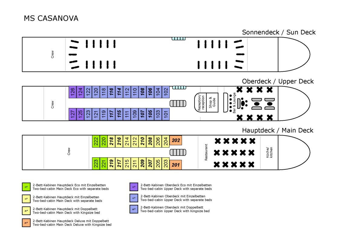 Die MS Casanova verfügt über 48 Außenkabinen auf zwei Decks – jeweils ca. 12 m² groß und ausgestattet mit Dusche/WC, Föhn, Sat-TV, Safe (gegen Kaution), Minibar, Bordtelefon sowie individuell regulierbarer Klimaanlage. In den Eco-Kabinen kann es zu wahrnehmbaren Motor- und Generatorengeräuschen kommen. Kabinen mit Einzelbetten verfügen über zwei getrennte Betten, von denen eines tagsüber als Sofa genutzt werden kann. Die Kabinen mit Doppelbett sind mit einem großen Bett (1,60 × 2 m) mit zwei einzelnen Matratzen ausgestattet.