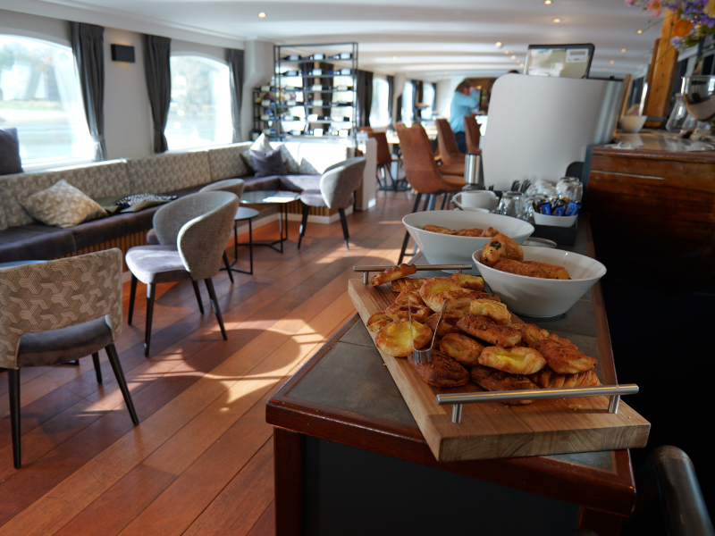 Auf dem Oberdeck befindet sich ein geschmackvoll eingerichteter Salon mit einem Restaurantbereich, einer netten Bar und einem Loungebereich mit Sitzecken, Klimaanlage, Fernseher und großen Panoramafenstern. Wi-Fi ist verfügbar. Große Glastüren führen auf das schöne, teilweise überdachte Sonnendeck aus Teakholz mit Stühlen und Tischen zwischen dem Salon und dem Steuerhaus. Fahrräder können auf dem Vorderdeck abgestellt werden.